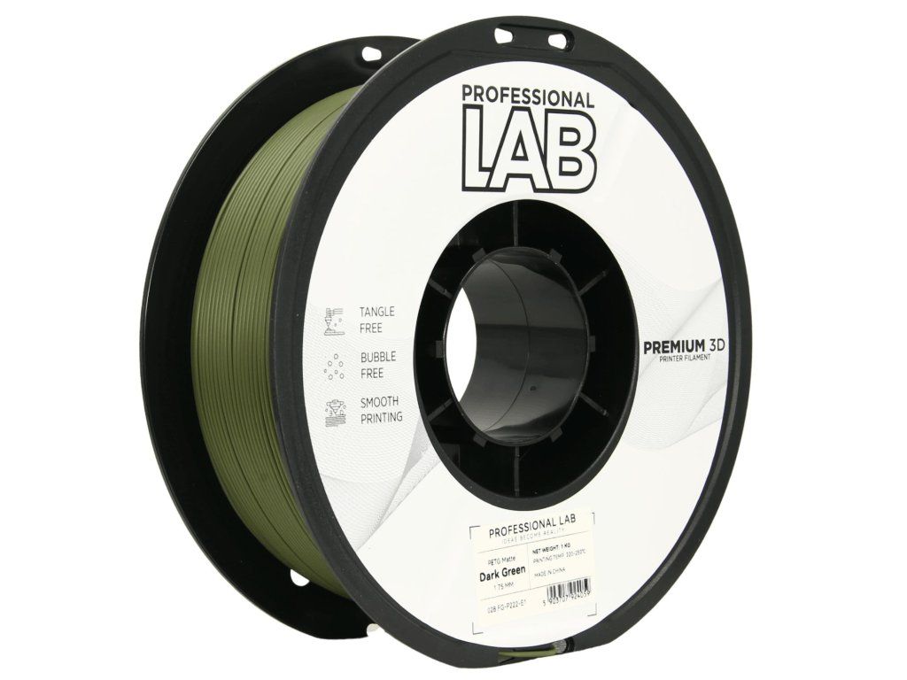 Prof. Lab Filament PETG Matte tmavě zelená 1,75 mm (1 kg) je prémiový filament pro 3D tisk, který kombinuje špičkovou kvalitu, snadnou tisknutelnost a moderní matný vzhled. Tento PETG filament je navržen pro široké spektrum použití – od funkčních technických dílů až po designové modely, kde je kladen důraz na detail a estetiku.