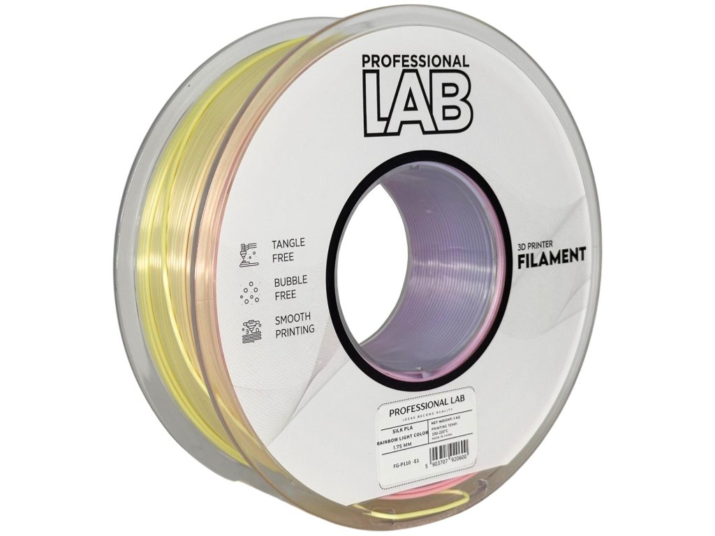 Professional Lab Filament PLA SILK Rainbow Light Color je prémiový PLA filament s hedvábným (SILK) povrchem a světlým, jemným duhovým barevným přechodem. Tato varianta je ideální pro uživatele, kteří chtějí dosáhnout elegantního, čistého a moderního vzhledu výtisků bez výrazně sytých nebo tmavých barev. Díky světlému rainbow efektu vyniknou detaily modelu a výsledný tisk působí lehce, vzdušně a profesionálně.