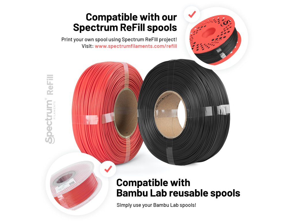 Filamenty Spectrum ReFill byly vytvořeny s ohledem na vaše pohodlí, ale také s ohledem na životní prostředí. Filamenty jsou navinuty na ekologickém, kartonovém jádru, plně kompatibilním s cívkami tiskárny Bambu Lab, což eliminuje nutnost použití dalších adaptérů. Kromě toho jsou vlákna ReFill bez cívky šetrná k životnímu prostředí, snižují plastový odpad a podporují udržitelný rozvoj. Pokud nemáte cívku od Bambu Lab, stáhněte si a vytiskněte si jednoduchý model cívky dostupný na webu Spectrum. Další variantou je nákup cívky Spectrum Refill spool. Díky tomu si můžete užívat vlákno Spectrum ReFill bez obav o kompatibilitu s vaší tiskárnou a přitom dbát na životní prostředí.